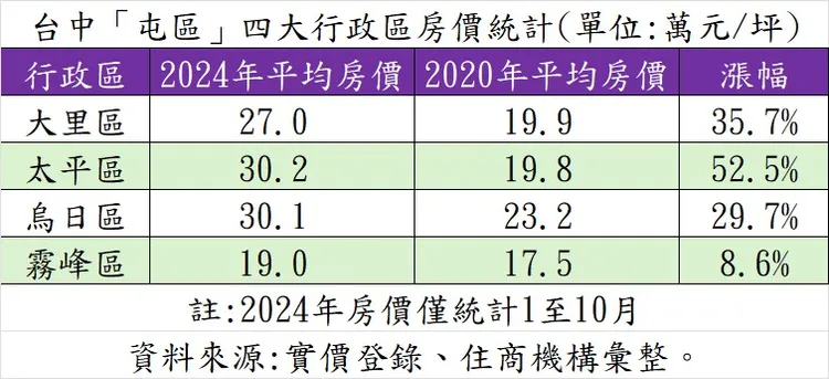 根據實價資料,屯區四大行政區中,以太平區今年截至10月為止,平均成交行情達30.2萬元最高,且對比2020年房價,該區漲勢達52.5%,漲幅也是冠居四大行政區之首。賴志昶分析,太平區位置鄰近東區、北屯區,不僅能汲取到台中市舊市區機能,區段又有新光特區等房市熱區吸引建商進駐,同時在北屯區區域房價外溢之下,致使太平區中古房價站穩3字頭。