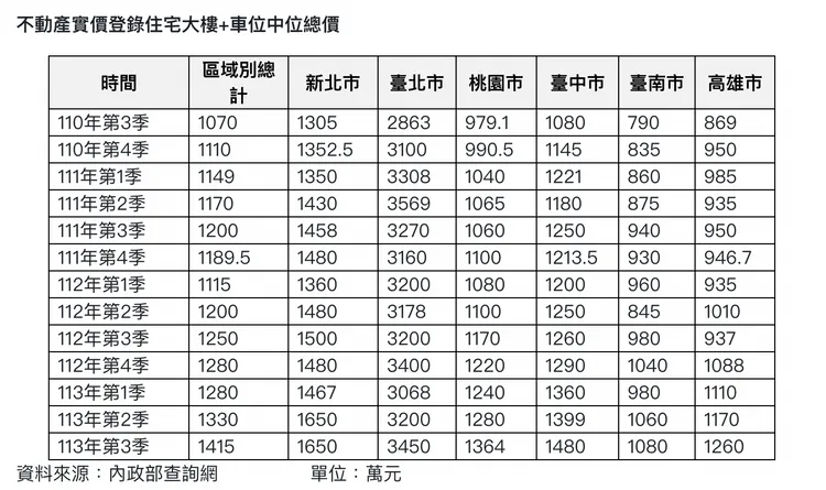 統計顯示,從去年第四季開始就首度出現六都電梯大樓加上車位中位價格,全數站上千萬元,最近兩季這樣趨勢更為確立,房價最低的是台南市,電梯大樓加上車位中位價格為1080萬元,3年房價上漲近300萬,房價漲勢較快的還有高雄市,今年第三季電梯大樓加上車位中位價已經拉高到1260萬元,較3年前漲近400萬元,包括新北、桃園、台中、台南與高雄市,電梯大樓加上車位總價都突破千萬元,也因為房價近兩年實在漲太快,資金不斷流入房市,迫使央行出手引導房市降溫。