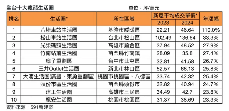 亞軍松山車站生活圈,當地因開發早,周邊多為屋齡較高的中古大樓及公寓,加上當地可供開發的大面積素地稀缺,據591生活圈顯示,當前僅有「松捷樂」、「嘉磐101」等案在售。這次漲幅突破3成,主因就是在台北小巨蛋、南京復興等精華區塊有不少預售豪宅案交易,大幅拉高區塊價格,使當地出現補漲潮所致。