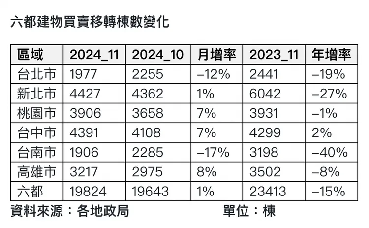 統計顯示,11月六都建物買賣移轉棟數1.98萬棟,年減15%,但月增1%,台北市11月建物買賣移轉棟數跌破兩千棟,剩下1977棟,年減19%,新北4427棟年減27%,桃園市3906棟年減1%,台中市4391棟年增2%,台南市1906棟年減40%,高雄市3217棟年減8%。