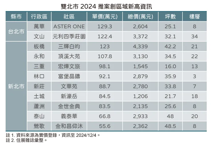 除了百萬宅外,新北市其他區亦有新案價刷新區域新高價,破單價9字頭的為三重區套房案「宏燁文旅」與林口區「富堡晶鑄」的露臺戶,8字頭的有新莊區「文華苑」露臺戶、土城區「新濠岳」,和蘆洲區「金世金典」,而泰山區「義泰華」與鶯歌區「金和昌仰沐」則分別以66.8萬元、55.6萬元榮登當地最高單價社區。