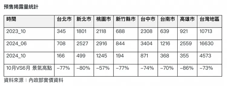 統計顯示,10月預售揭露量較6月的景氣高點大幅衰退,全台剩下近4600件,較六月的1.66萬件銳減近7成,主要都會區全面受到影響,台北市剩下不到兩百件,10月平均一天成交6件預售,新北市也僅剩約500件,較6月景氣高峰衰退近8成,桃園市1245件,較6月高峰減少57%,新竹縣市也剩約200件,台中市剩下871件,台南與高雄市都跌破月交易400件,除了桃園市以外,普遍都較6月景氣高峰時衰退7成。