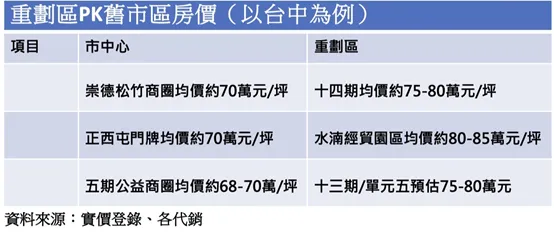 而這幾年重劃區重劃區房價爆衝,拉開舊市區房價差,。據實價登錄資料顯示,14期新屋均價高達75-80萬元、周圍崇德松竹均價約僅70萬元;水湳經貿園區新案均價高達80-85萬元,但鄰近周邊西屯區域均價約僅70萬元,而南區包括大陸、順天、國泰、豐邑、惠宇、鉅虹、富宇等知名品牌建商紛紛13期重劃區,其中大陸建設以8字頭高價購地,市場分析未來房價上看8字頭,南台中後續房價的補漲態勢已相當明確。
