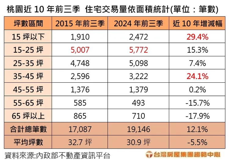 各坪數之間,交易量增幅第二名的為35~45坪的中坪數產品,增幅24.1%,成長性比15~35坪的物件更明顯,在近年房市盛行的小宅風潮中逆勢突圍。張旭嵐指出,桃園的中坪數物件增溫,則主要受到「育兒族」與「脫北族」兩大買盤力挺。桃園房價較雙北平實,在相同預算下,能買到比雙北更大的坪數,吸引不少雙北家庭客移居,以今年11月桃園出生率達千分之8.22,高居六都第一,顯示親民房價給桃園家庭勇敢生育的底氣!