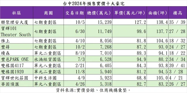 根據實價登錄,台中市2024年十大豪宅交易中,以七期重劃區的「聯聚理安大廈」獨占鰲頭,該社區35樓戶總坪數約138.4坪,10月以總價1億5,239萬元成交;其中,該戶扣除車位成交單價換算約127.2萬元,創下台中市有預售實價以來的最高紀錄。