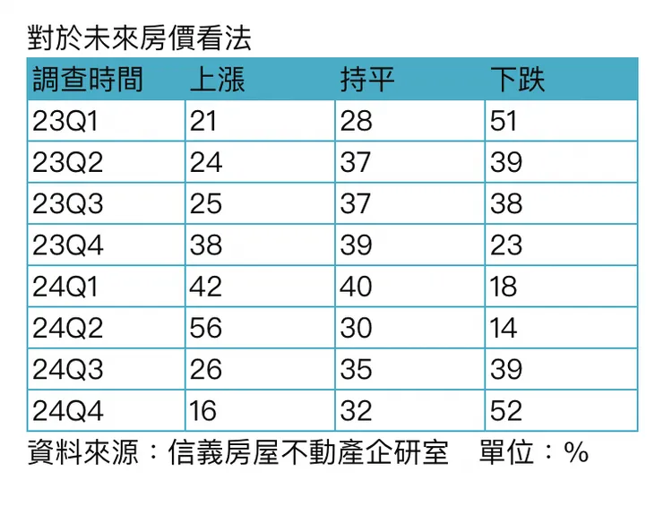 此次問卷調查顯示,半年前景氣看法最樂觀的時候,有高達56%的受訪者認為房價會上漲,但央行喝咖啡與第七波選擇性信用管制影響,連續兩季房市樂觀情緒都反轉往下,此次調查剩下16%看漲房價,看跌房價比例達52%,整體房市已經沒有不買會更貴的氛圍。