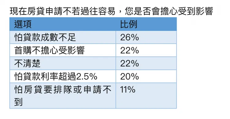 至於房貸限縮影響調查,有26%擔心貸款成數不足,連兩次調查貸款成數都是民眾最擔心的部分,僅有22%表示首購不擔心受影響,另外有20%擔心房貸利率會超過2.5%,11%受訪者擔憂怕房貸要排隊或申請不到,20%受訪者則認為不清楚。