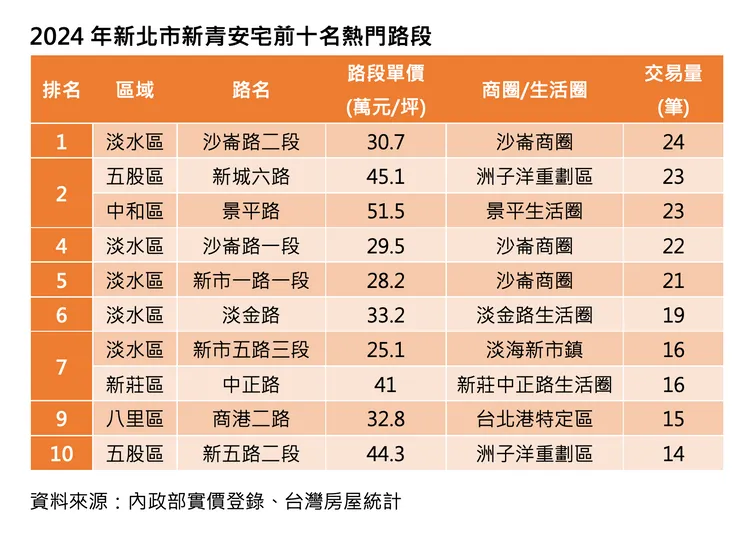 台灣房屋集團趨勢中心執行長張旭嵐表示,這些熱門路段當中,淡水區就有5個路段進榜,主要是因為淡水區目前成交單價落在2、3字頭,房價仍相對親民,沙崙商圈、淡海新市鎮部分社區,1200萬元約可購入屋齡五年內,大兩房或小三房的產品,吸引許多年輕首購族入手。而中和、新莊、八里區則各有1個路段進榜,其中環狀線沿著中和景平路設有四站點,新莊中正路也有捷運新蘆線經過,交通生活機能佳,要買到總價1200萬元以內的物件,多以3房老公寓居多。