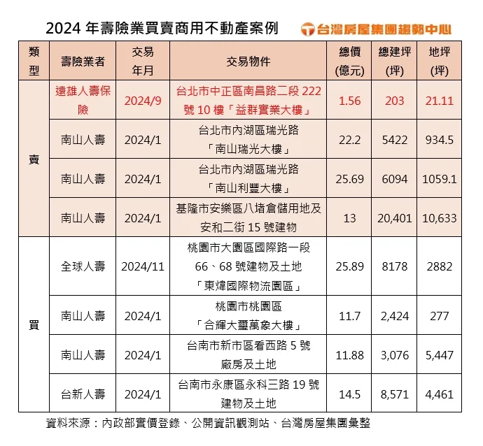 不過,壽險業不動產交易有出也有進,像是全球人壽去年11月,以25.89億元買下桃園大園區「東煒國際物流園區」廠辦;另外,壽險業者也看好台南的南科廠辦需求,去年1月,南山人壽以11.88億元購入新市區看西路5號廠房及土地,而台新人壽則以14.5億元取得永康區永科三路19號建物及土地。