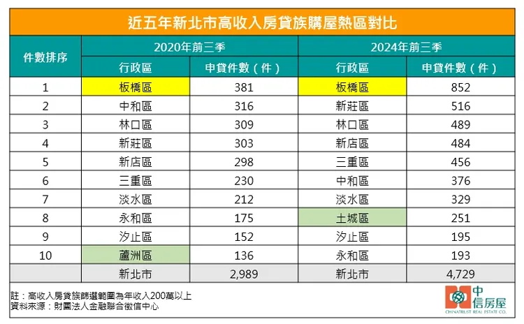 對此,中信房屋研展室副理莊思敏指出,近年來新北市高收入族群申貸購屋愈來愈熱絡,這一現象可歸因於兩個主要因素:一是高收入族群的聚集,二是理財觀念的轉變。首先,最近幾年在台商回流、產業發展、重點建設的加持下,新北市吸引了大量企業主、企業中高階主管以及科技新貴的駐足,此外,新北的房價相較於台北仍具競爭力,豪宅的入手門檻相對低,所以也有不少台北市的高收入族群選擇到新北置產。另一方面則是理財觀念的轉變,在過去,富人大多傾向現金買房,但現在越來越多的有錢人選擇善用銀行貸款,將更多現金保留在口袋中,並將其投入其他投資渠道,以提升資產運作的靈活性。