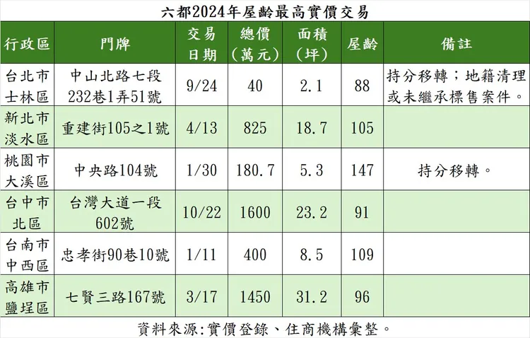 根據實價,台北市去年9月位於天母古道旁一處老宅,總價40萬元出售部分持分,並被備註為地籍清理或無人繼承的標售案件,由於該戶屋齡高達88年,位居北市去年屋齡最高之交易;至於桃園市屋齡最高交易,為大溪老街商圈一處透天店面,該戶部分持分去年1月以總價180.7萬元成交,屋齡高達147年,為去年六大都會區所有交易中,屋齡最高者。