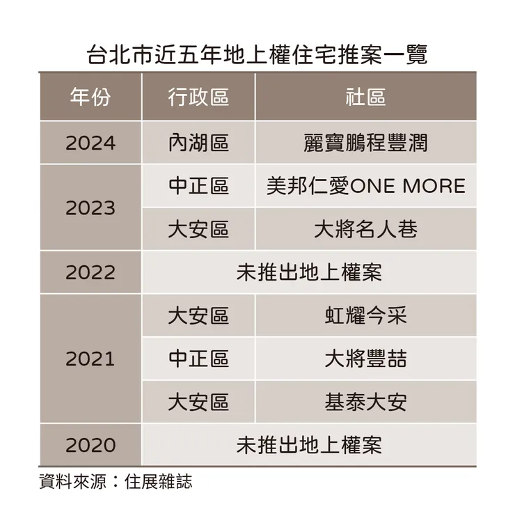 以僅推出一個地上權案的2024年來說,位於內湖區四期重劃區的「麗寶鵬程豐潤」,單價開在9字頭,比起內湖區新案價打了七五折;而2021年在古亭生活圈的「虹耀今采」與中正紀念堂周邊的「大將豐喆」,分別交易在單價8字頭與6字頭水位,對比當時該地的區域新案行情約打了六折,有一定吸睛效果,也透露出這類物件的市場價值。