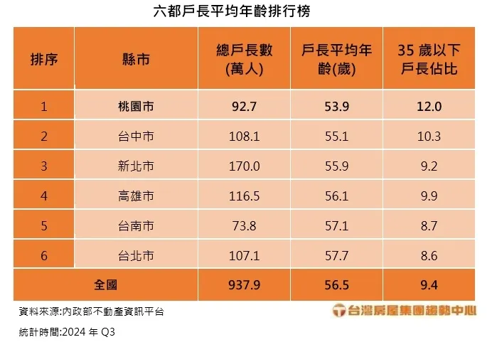 進一步分析桃園市13個行政區,其中以龜山區的戶長平均52.4歲年齡最嫩,且35歲以下的戶長比例達14.3%。