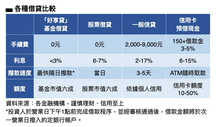 「好享貸」提供投資人以基金作為擔保品的資金融通服務,當面臨醫療支出、房屋修繕等短期資金需求時,不必贖回基金即可取得資金,讓投資規劃不中斷,也有助基金規模與配置穩定。該服務具備「靈活選、安心借、方便貸、彈性還」四大特色,目前可作為擔保品的基金共209檔,最低1000元即可申請,線上審核後最快隔天撥款。