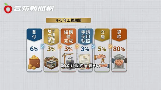 「一般預售屋工程期約4至5年,購屋族不需要一次準備全部資金,可以依照進度分階段付款。」