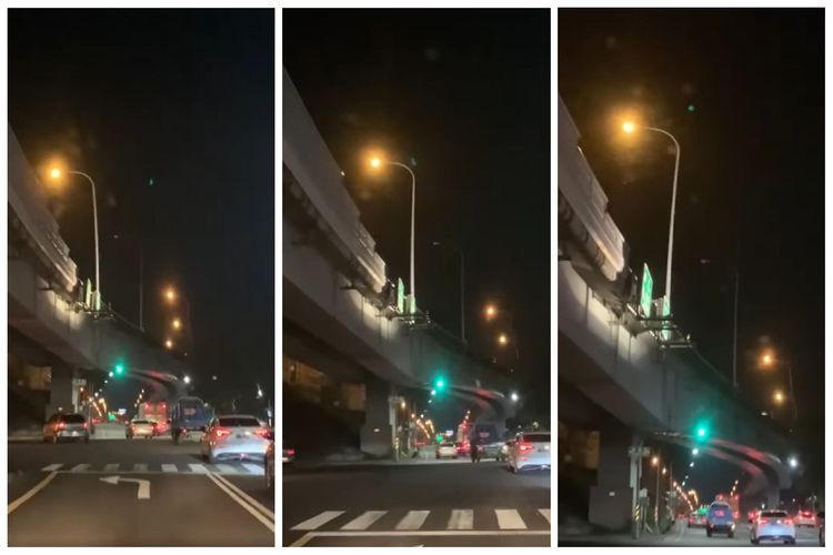 影片中,只見駕駛開車行經一處高架道路下方,隔壁的幼童當場拍下天搖地動、路燈搖晃的影片,還說「快你看,橋會斷掉。」