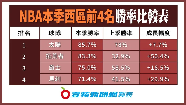 至於高居第2的拓荒者,本季一樣戰讓人訝異,上季他們因一哥李拉德(Damian Lillard)受傷,中斷連續8年打進季後賽的紀錄,本季李拉德傷癒歸隊,但拓荒者陣容並不完整,並不被看好,季初拉出一波4連勝,不過李拉德最近因大腿拉傷要停賽1到2周,拓荒者能否保住西區前4是一大考驗。