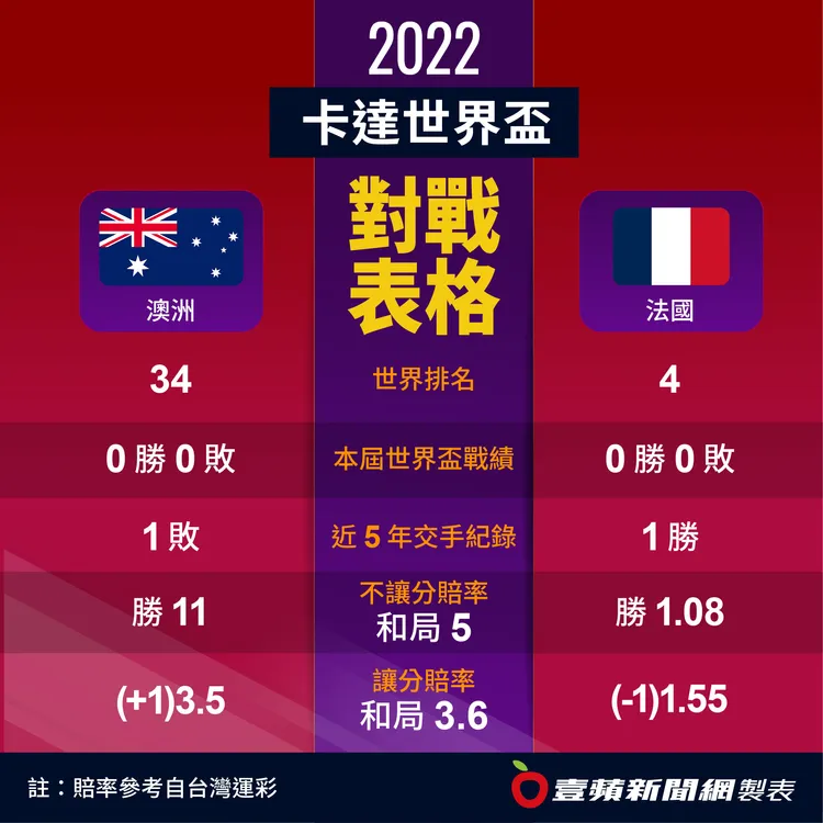 澳洲在洲際附加賽擊敗秘魯,自2006年起連續5屆闖進會內賽。主力球員幾乎都在國內踢球,進攻火力不佳是最大問題,附加賽也無法攻破秘魯後防,最後靠12碼PK戰才搶下門票。法國雖然飽受傷兵所苦,但實力仍高出許多,澳洲想複製20年前塞內加爾爆冷門的戲碼,無疑是不可能的任務。