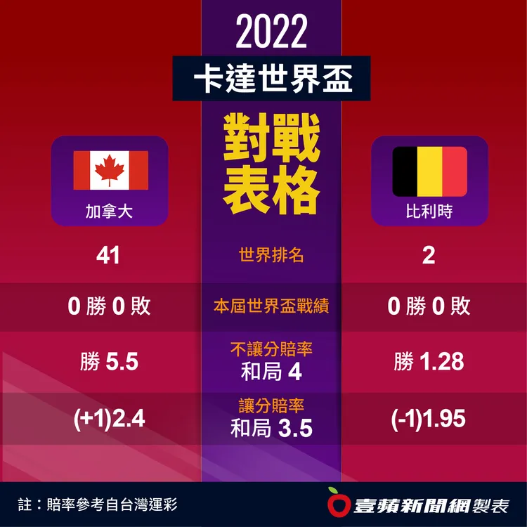 2隊上周最後一場友誼賽,比利時以0比1不敵沒有踢進會內賽的埃及,加拿大則是以2比1力克日本。比利時整體戰力當然較強,但加拿大近況不錯,即使不能爆冷門,比利時想輕鬆過關也不容易,讓球的風險很高。