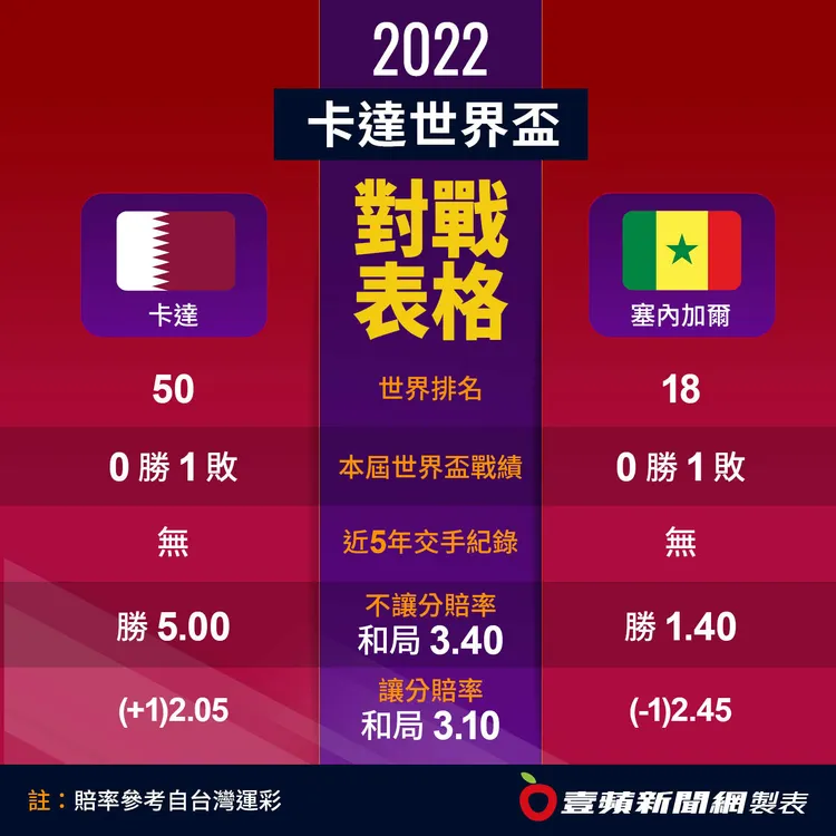 過去兩隊沒有交手的紀錄,今兩軍對戰,塞內加爾勢必要拿卡達出氣和進補,拿下這場之後,最後1戰再找厄瓜多做最後對決,以此看來,卡達今晚恐怕凶多吉少。