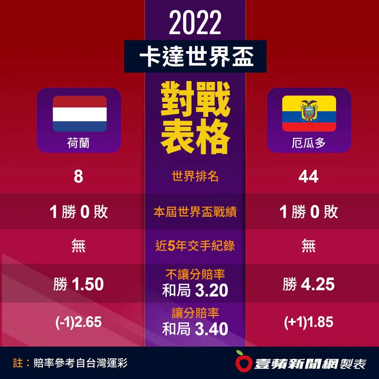 本屆世界盃荷蘭最大優勢就是防守,由有「世界最佳後衛」范戴克(Virgil van Dijk)領軍後防線非常穩固,而厄瓜多進攻集中在老將瓦倫西亞(Enner Valencia),他1人獨包厄瓜多過去世界盃5顆進球,而荷蘭的防守大軍只要鎖死瓦倫西亞,就等於立於不敗之地。