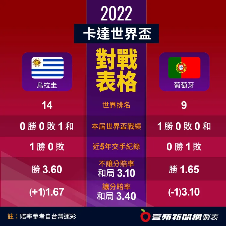 烏拉圭是南美勁旅,對上巴西、阿根廷雖然討不到便宜,但是對上歐洲球隊卻是輸少贏多,加上葡萄牙隊史上,對上南美洲球隊9次僅拿下1勝,其餘8戰5敗3和,對葡萄牙來說,恐會有一番苦戰,加上烏拉圭首戰意外被逼和,這場比賽勢必會全力搶攻。