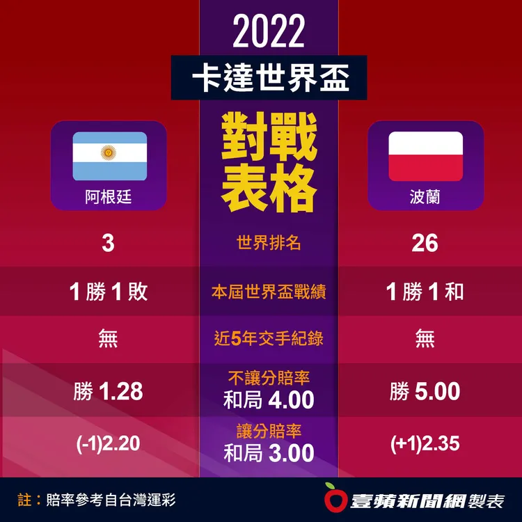 阿根廷今天必須擊敗波蘭,才能確定晉級。一旦和局,將視墨、沙戰決定排名。沙烏地阿拉伯若勝就晉級,若墨西哥勝,而且贏3球以上,將超越阿根廷。阿根廷若不敵波蘭,沙烏地只要逼和墨西哥即可晉級。1隊是非贏不可,1隊是輸球還有希望,純以心理壓力來看,阿根廷的負擔相對較重。