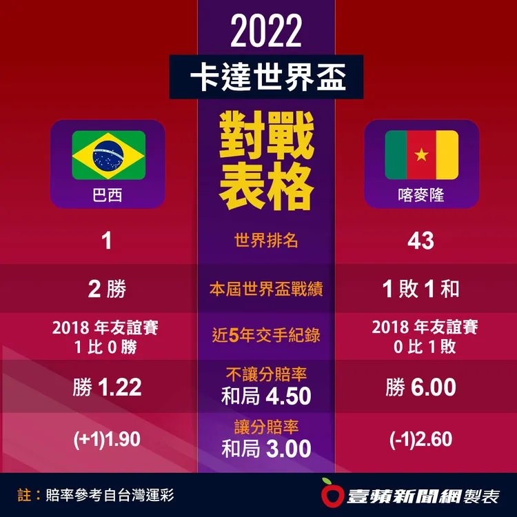喀麥隆首戰敗給瑞士後在世界盃吞下7連敗,第二輪賽事最終以3比3逼和塞爾維亞,才終止世界盃7連敗的不名譽紀錄。喀麥隆過往在世界盃對戰過巴西2次,1994、2014都以3球之差落敗,此戰預計還是巴西輕鬆過關。