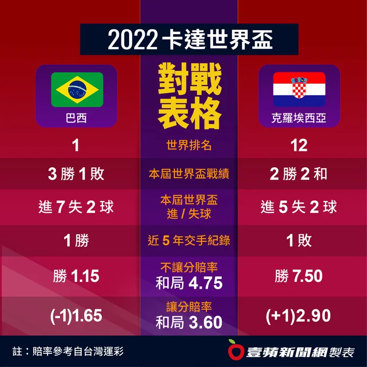 但克羅埃西亞絕非弱者,世界盃至今4場都未輸球,小組賽遇到摩洛哥和比利時兩強都以0比0踢平,16強對上日本也先以1比1僵持120分鐘,再靠PK奪勝,此役遇到佔上風的巴西,克羅埃西亞可能也會如法炮製,先求逼和,再伺機求勝。
