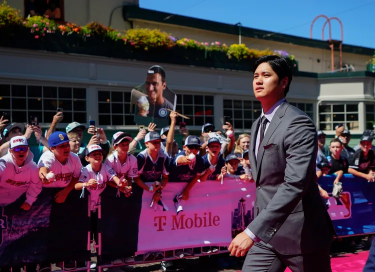 大谷翔平是德國精品BOSS品牌的代言大使,今天也穿該品牌的灰色西裝搭配同色系領帶走紅毯,展現出好身材,他在走紅毯時,不斷有球迷高聲尖叫。