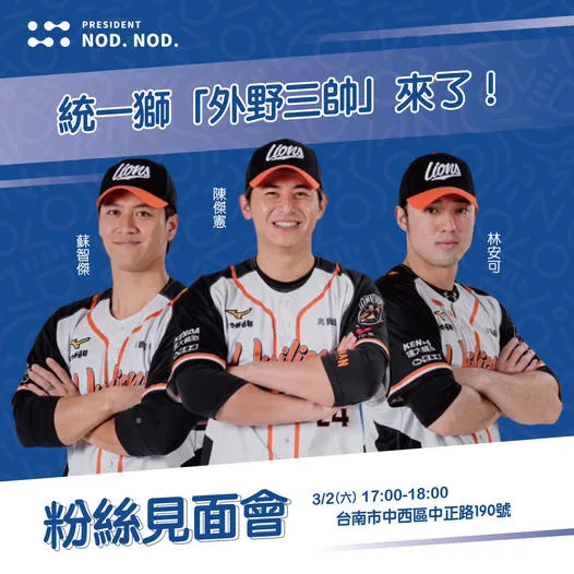 「總裁點²頭」旗艦店將於後天正式開幕,今天特別舉行「總裁點²頭 X 統一獅粉絲見面會」,邀來外野手陳傑憲、蘇智傑、林安可與粉絲見面歡,推出活動當天限定飲品套組。