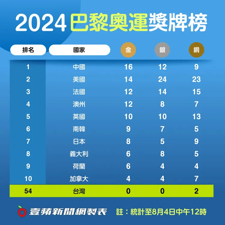 而今天凌晨的拳擊女子66公斤級,台灣「抗癌拳王」陳念琴也已打進4強,確定有牌,但目前還沒有確定成色,所以未掛上獎牌榜,而晚上台灣羽球好手「麟洋配」王齊麟和李洋,將在男雙爭金,這也將是今年巴黎奧運中華首面金牌或是銀牌。