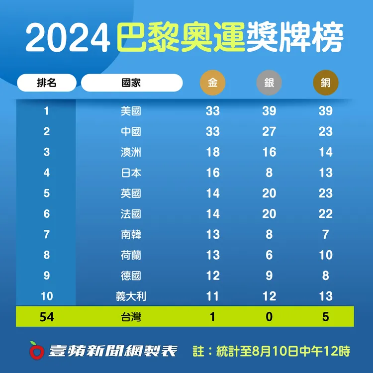 目前美國和中國競爭榜首陷入激戰,兩國以33金打平,最後一天的比賽將決定榜首,東京奧運美國以39金險勝中國38金。