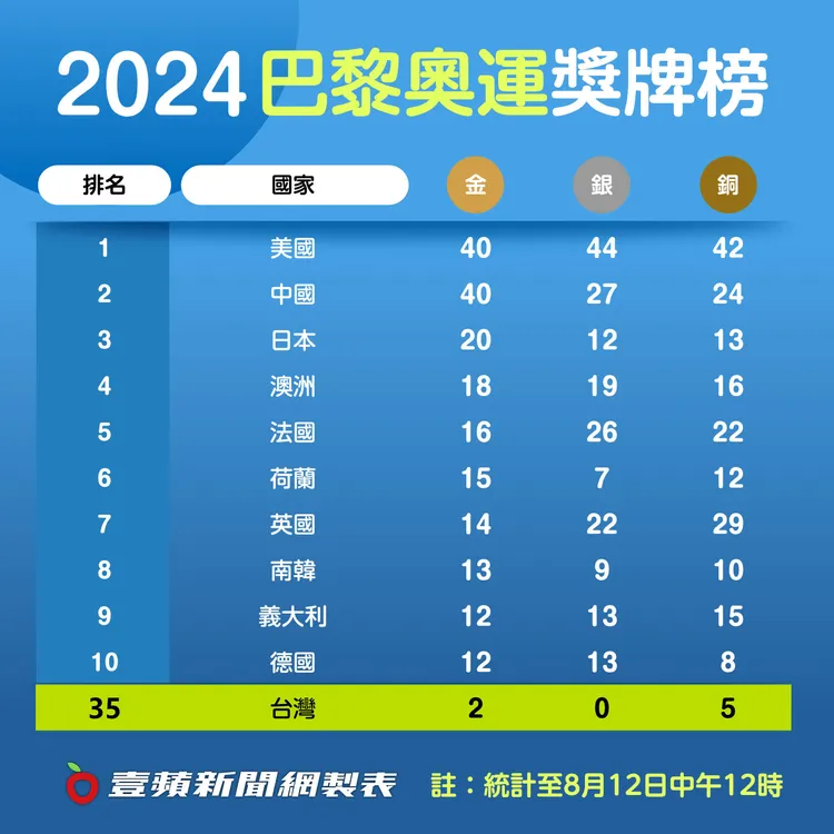 而今年巴黎奧運亞洲國家的表現很出色,除了中國拿到40金和美國一樣,日本也拿到20金,連續兩屆奧運衝進前3名,南韓拿到13金,比上屆的6金多了7金,從第16 名衝上第8名。