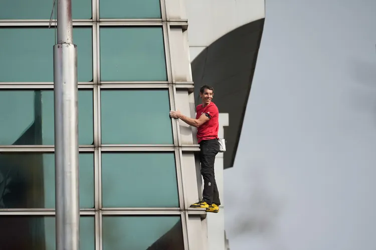 僅花16分鐘,雷諾德就到達難度最高,26層到90層竹節區的起點第26層樓,也向粉絲揮手打招呼,完成第1階段的攀爬任務。