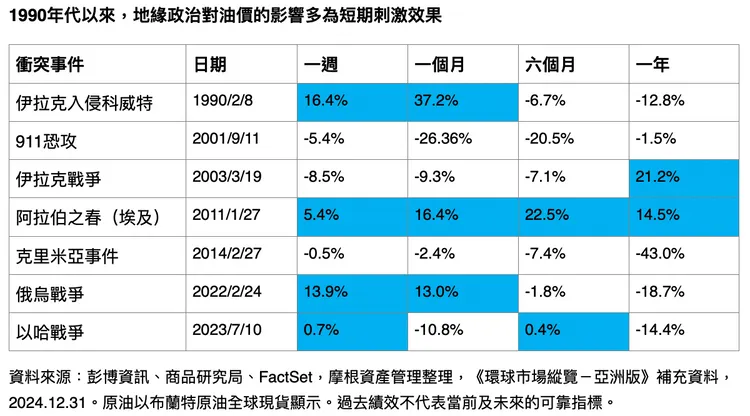 摩根資產管理環球市場策略師林雅慧表示,短期內能源市場因不確定性升高而提高風險溢價,糧食、能源、化肥與運輸價格都可能受到影響;但從歷史經驗來看,地緣政治事件對油價多屬短期刺激,長期仍會回歸基本面。統計1990年以來的案例顯示,多數衝突對油價的影響並不持久,價格通常在一段時間後回落至正常區間,因此當前亞股的回檔,也讓年初以來市場過度樂觀的情緒降溫,股市重新回到基本面評價。