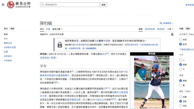 陳柏毓今天在比賽第5局中繼上場,先投出了觸身球,接著被澳洲捕手柏金斯(Robbie Perkins)擊出2分砲。賽後,他的維基百科介紹,從台灣職業棒球員,被改成了澳洲職業棒球員,而職業生涯的介紹中,也被加上了「WBC 2026 首戰先投了一顆故意觸身球後被對了一發兩分砲 成為敗戰投手」。