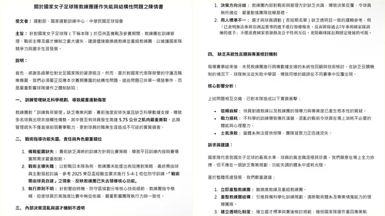 女足工會發出聲明,並曝光球員連署書,點出國家女子足球隊教練團運作失能與結構性問題。當中點出專業教練團,決定一支球隊能走多遠。請讓有能力的教練,從訓練與思維上帶給她們實質的成長與改變,讓她們真正看見世界足球的標準。