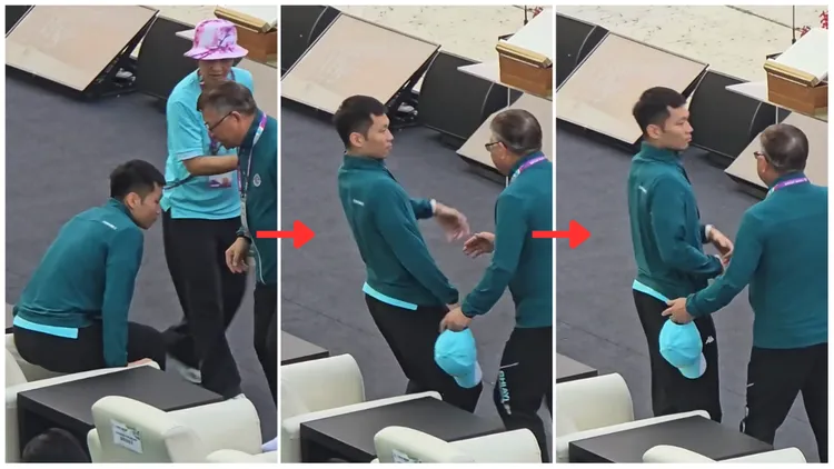影片顯示,身著綠色運動服的李洋,原本坐在休息區的白色沙發椅上,在看見有人向他走來時,先是起身與他握手問好;隨後該名長官並未坐下,而是轉而站立在李洋右方與之交談,讓原本欲坐下的李洋,瞬間整個人呈現45度回彈站好,接著與對方在耳鬢間交談。